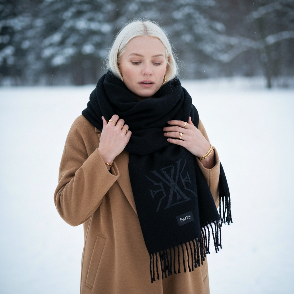 Oversized black cashmere scarf with tone-on-tone FSAKE monogram. Incredibly soft, effortlessly luxurious. The detail that elevates everything.
