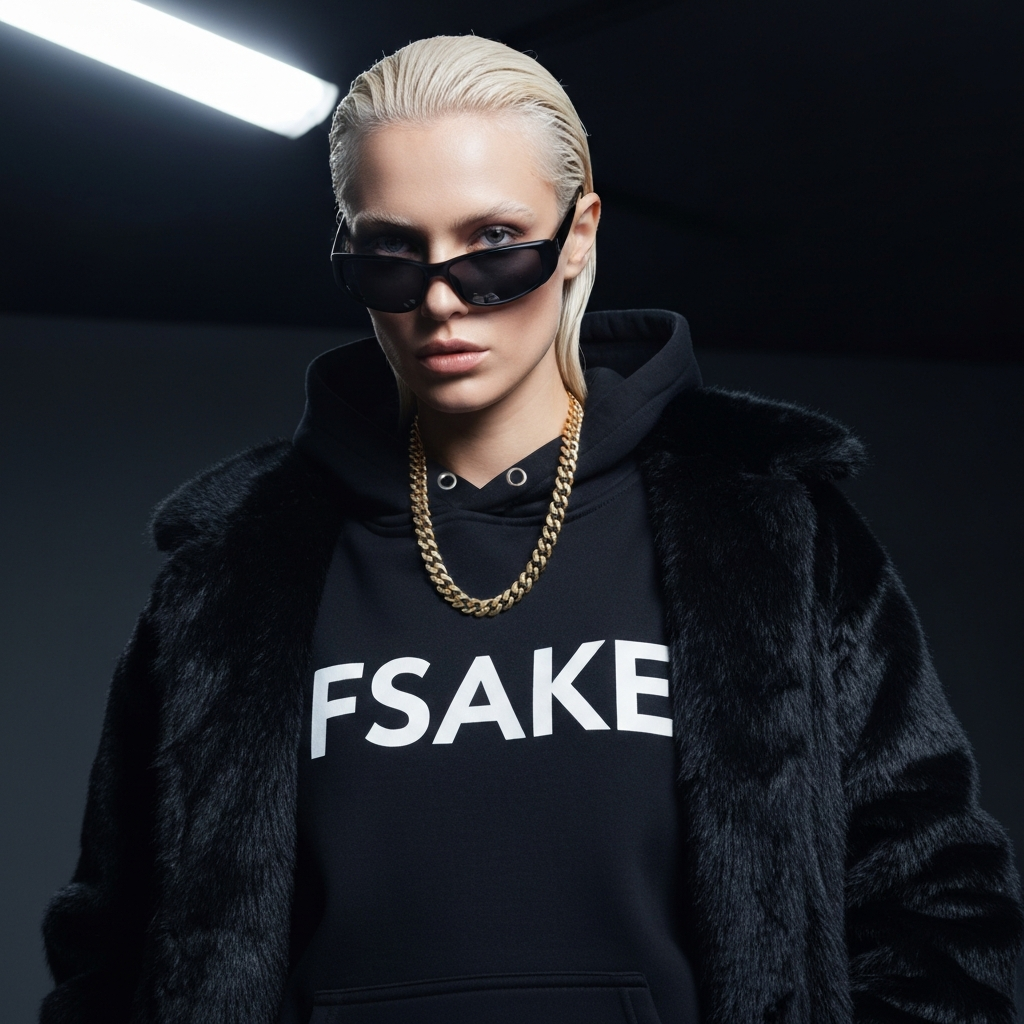 Oversized black hoodie with bold white FSAKE branding. 400gsm heavyweight fleece, dropped shoulders, ribbed cuffs. The foundation of the FSAKE wardrobe.